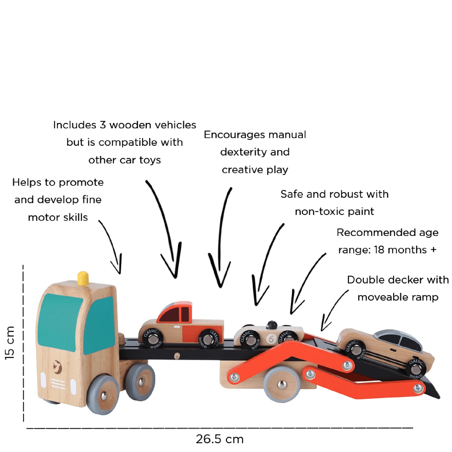 This double-decker Classic World Vehicle Carrier has a moveable ramp.  You can load three cars and turn into a second deck. It helps to promote and develop fine motor skills and also encourages manual dexterity and creative play.
