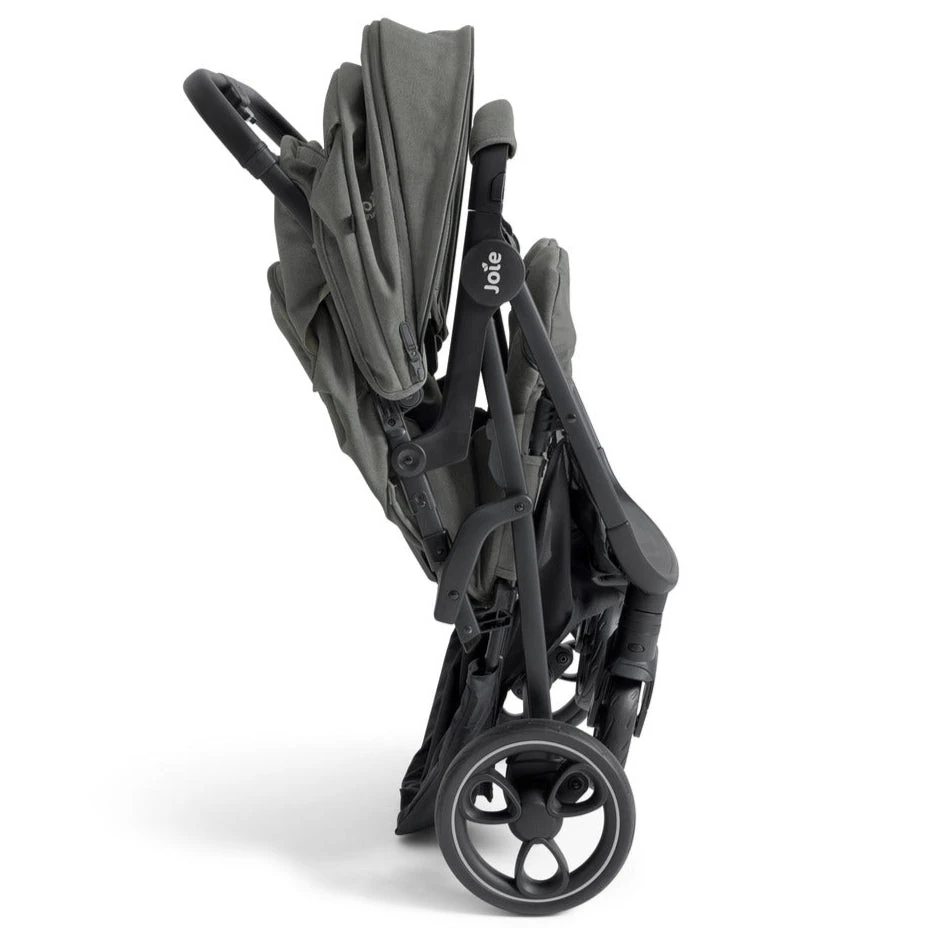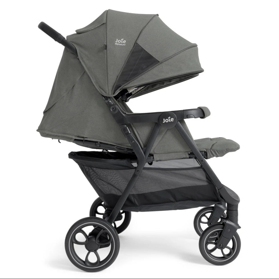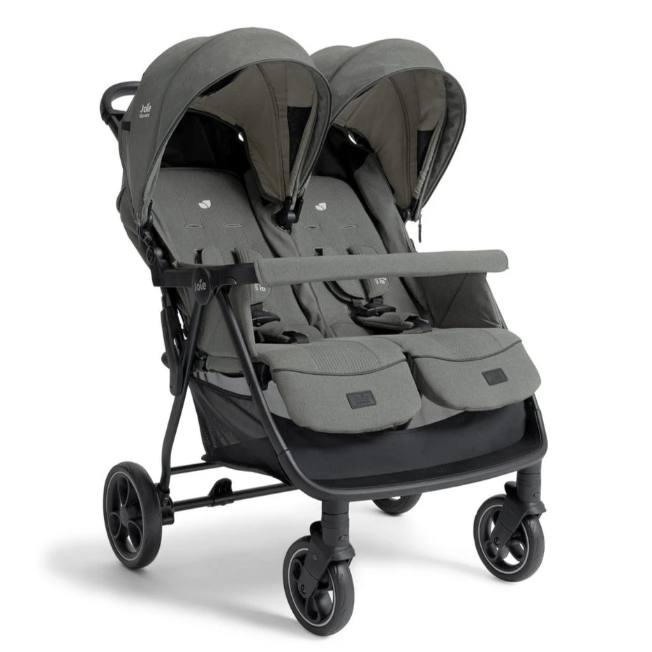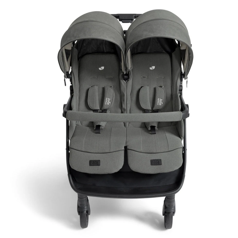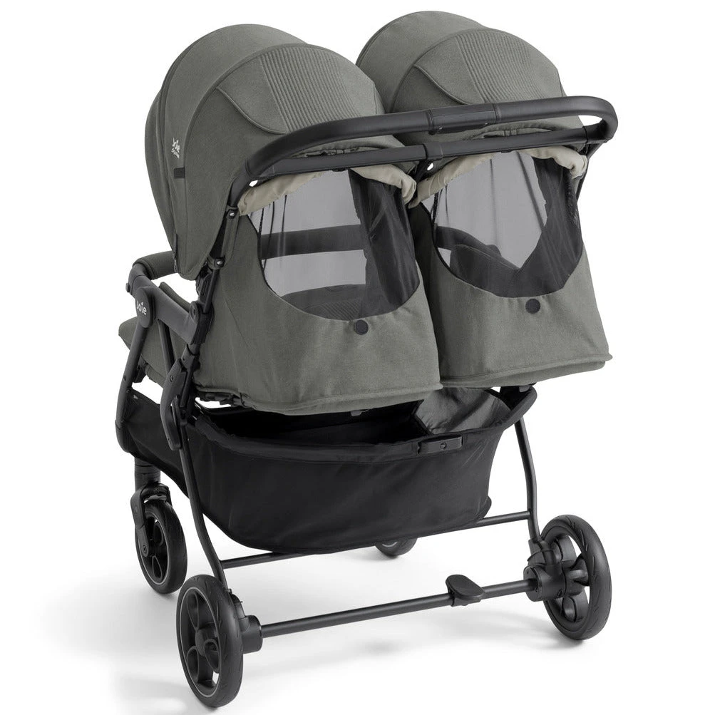 The Joie Estrella Signature Twin Stroller Evergreen is suitable from birth to 22kg (approx. 4 years) per seat. Ensuring a cosy and ergonomic environment for both newborns and toddlers. With all-wheel suspension for a smooth ride over rough terrain, UPF 50+ and water-repellent canopies for sun and weather protection, and a quick, one-hand fold for easy storage