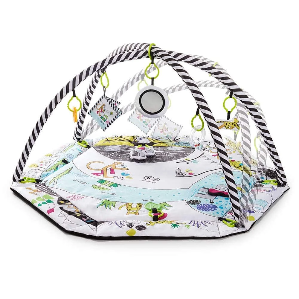 The Kinderkraft Smartplay Educational Playmat includes 7 toys of various cognitive and aesthetic values: mirrors, rustling book, 2 chews, rattle, squeaking tiger and a ringing elephant. The mat features different spots to attach toys depending on the child’s age and preferences. The unique black and white design stimulates your child’s senses.