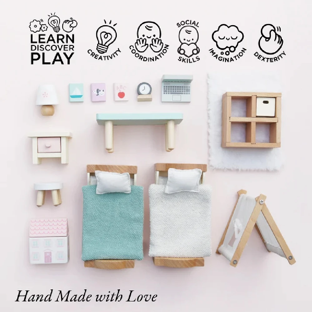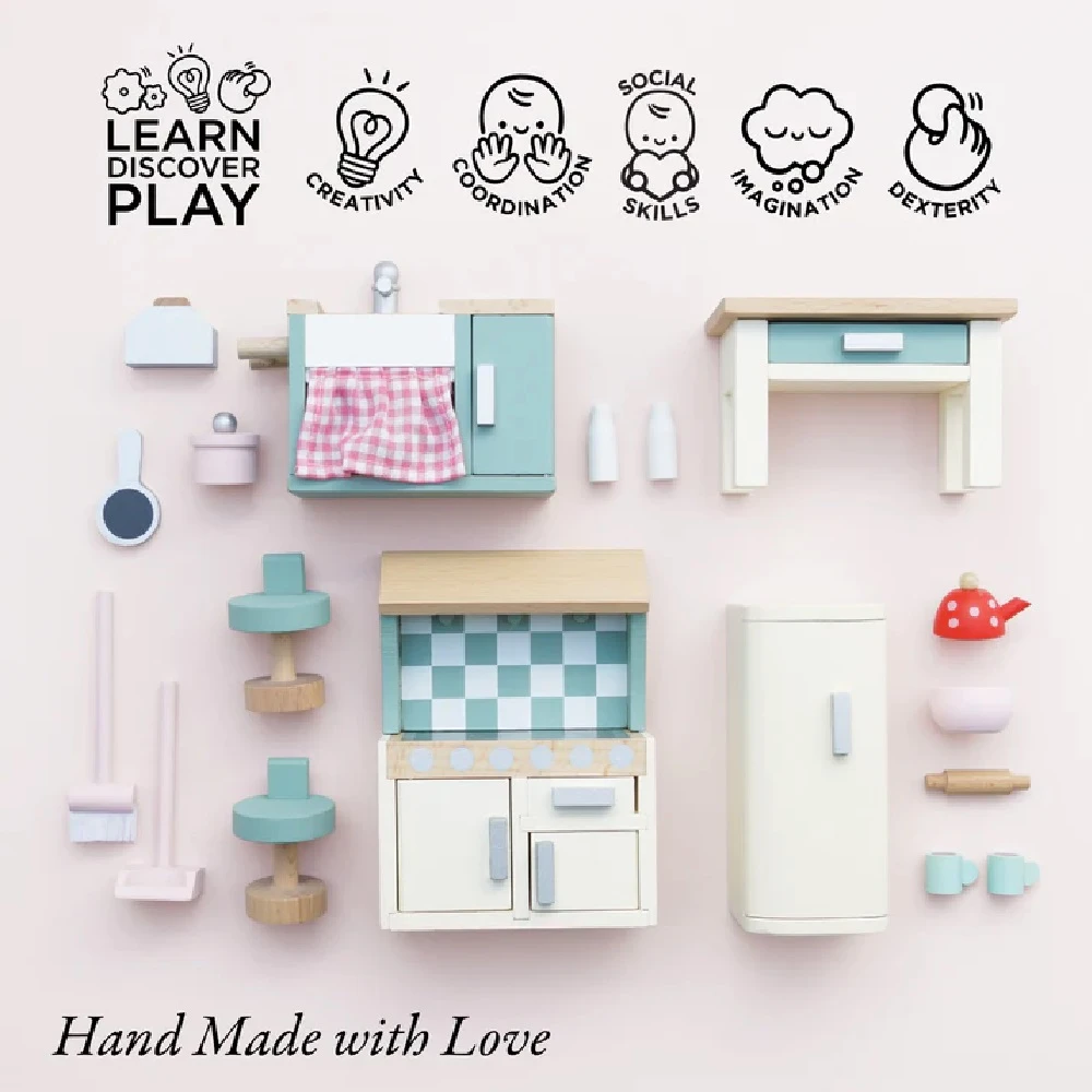 A thoughtful heirloom gift to treasure and pass down through generations. Embrace your child’s inner interior designer. This set comprises of 3 stylish, co-ordinating wooden furniture sets and accessories for endless playtime fun.