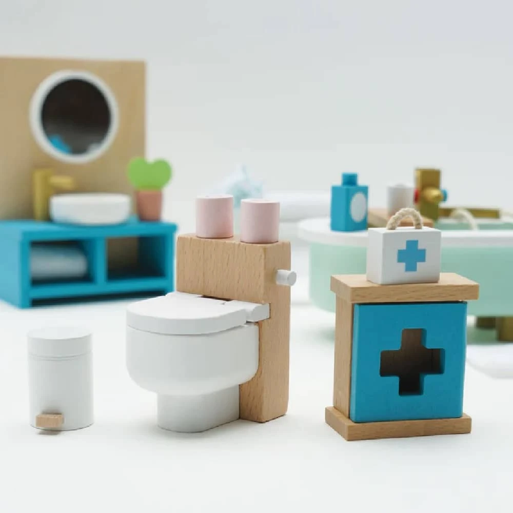 Featuring a beautiful freestanding bath, towel rail, toilet, sink unit plus a first aid cupboard and an assortment of accessories, little residents will scrub up a treat. Solid, sustainable, and stylish, this stunning set is crafted from FSC® certified wood and is perfectly scaled to fit our full range of beautiful wooden dolls houses.