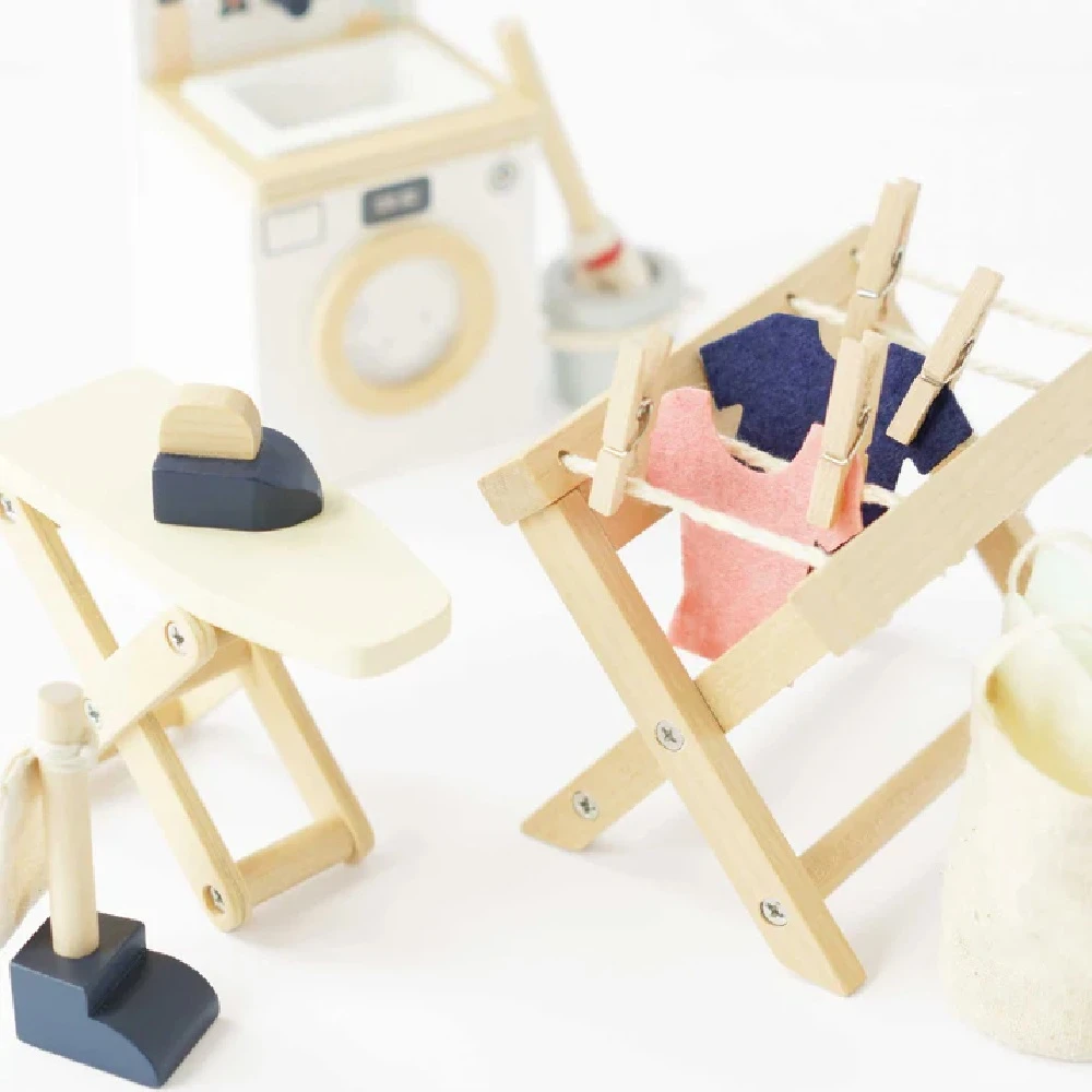 Scrub a dub dub. Washing tiny clothes just got a whole lot more fun with the sweetest Le Toy Van Doll House Laundry Room. Crafted from wood, this delightful 17 piece toy and makes a wonderful addition to small world play. Comprising a washing machine, washing line, iron & ironing board, 4 pegs, felt clothes, a broom & bucket, vacuum cleaner and more.