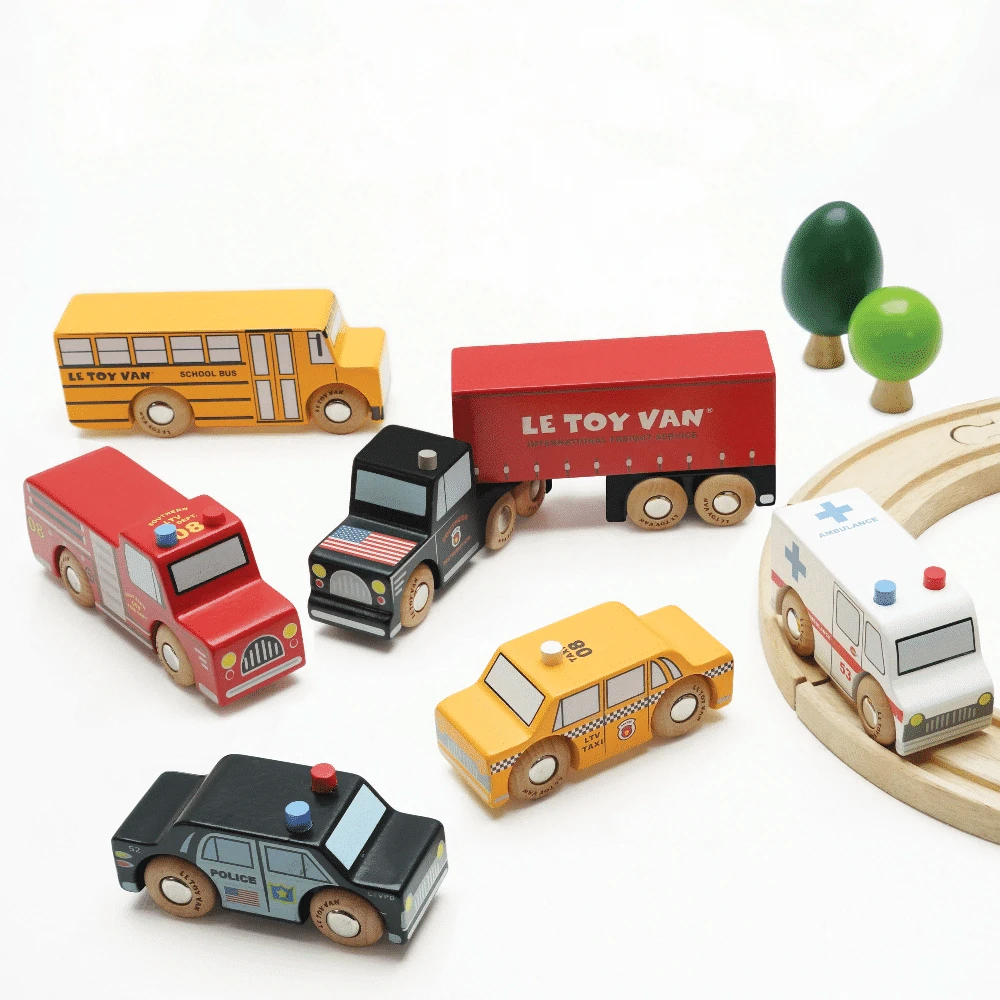 Comprising a 10-wheeler articulated truck, a school bus, a police car, a yellow taxi, an ambulance and a fire truck. Compatible with our exciting range of wooden trains sets and other standard train sets.