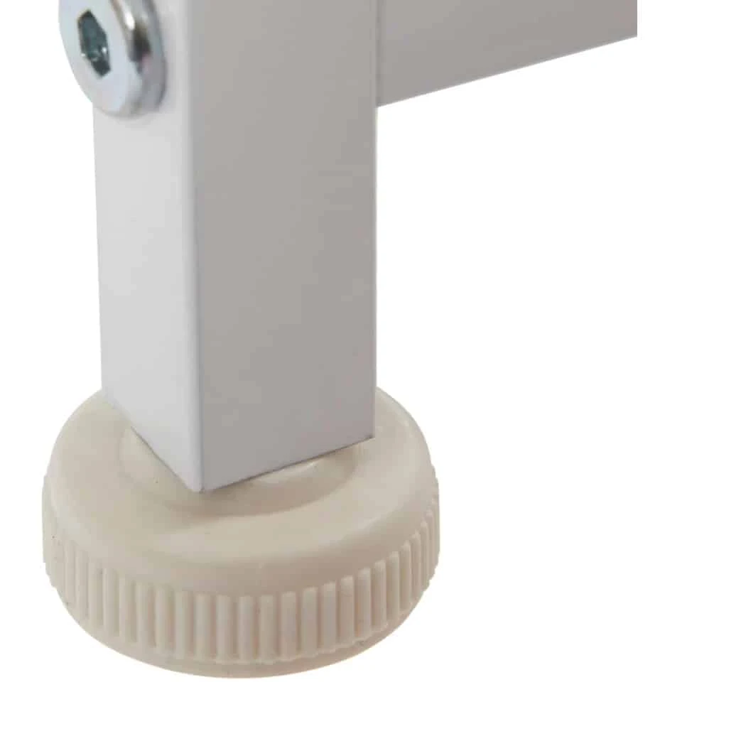 The frame is made from sturdy white steel and comes with plastic feet to protect floors from scratching. Feet are height adjustable and so uneven floors are not an issue.