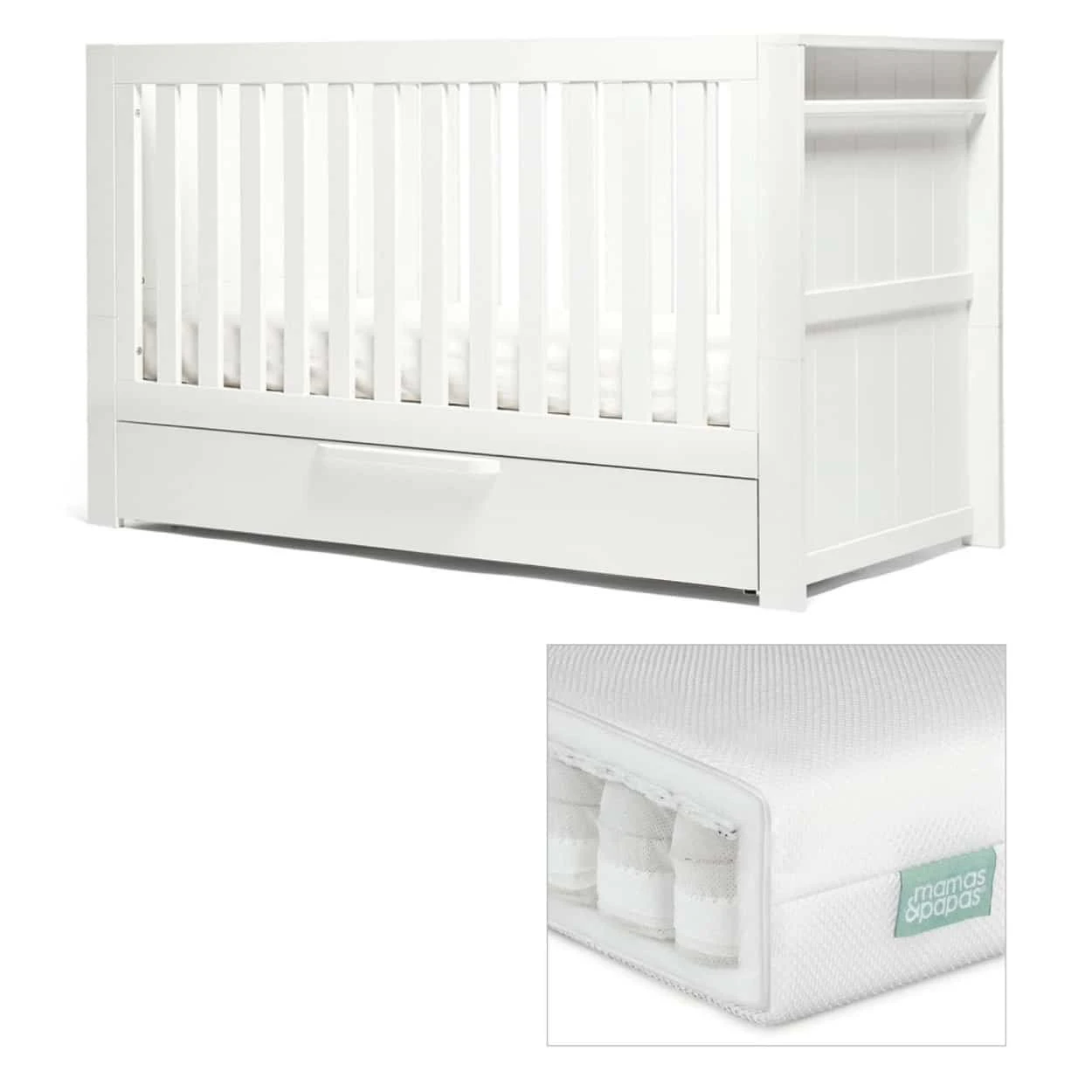 Baby will sleep soundly in the Mamas & Papas Franklin White Wash Cotbed With Premium Pocket Spring Mattress.Β It can used either as a baby cot, a toddler bed or day bed, itβll last for up to 4 years. With plenty of storage underneath and space to hang up muslins and blankets, keeping baby comfy and your nursery organised is easy.