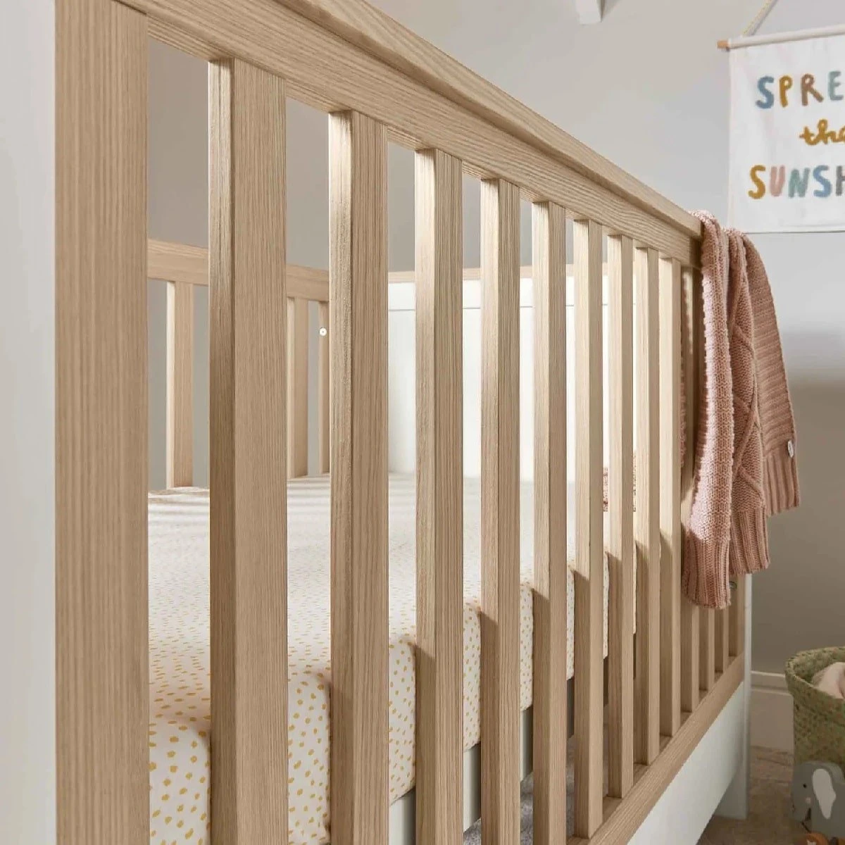 In our Harwell baby cot bed, your little one will have no problem dozing off to sleep. Because the Harwell baby cot bed has an adjustable base that can be set to three different heights, it can simply transforms into a toddler bed. This will save you from having to purchase a new piece of nursery furniture as your baby grows. And thanks to its two-tone finish, the Harwell Baby Cot Bed in white will look fantastic in whichever nursery you choose to put it in.