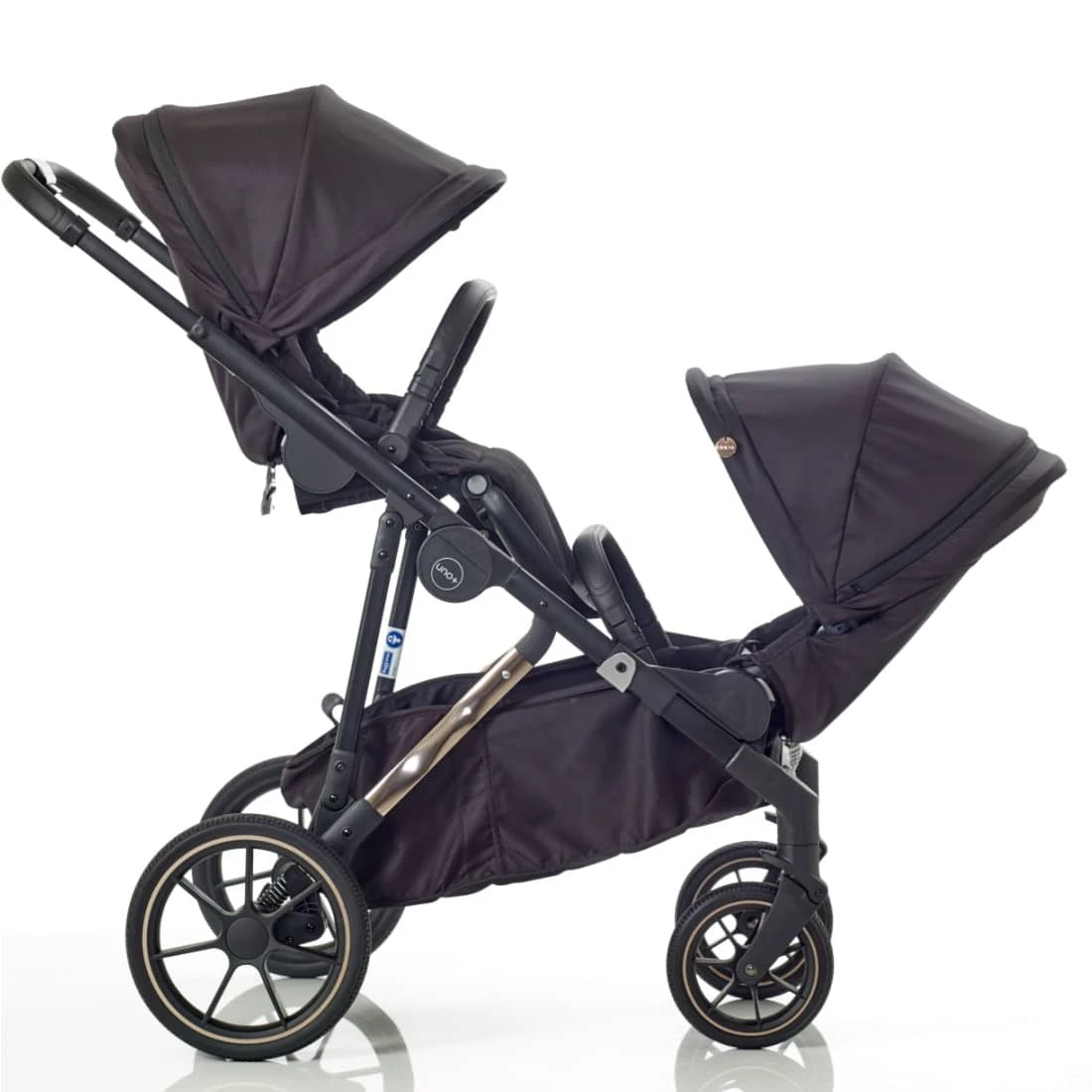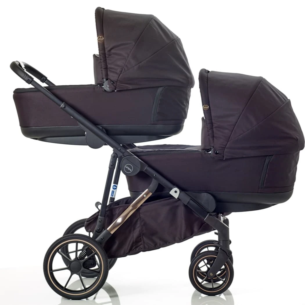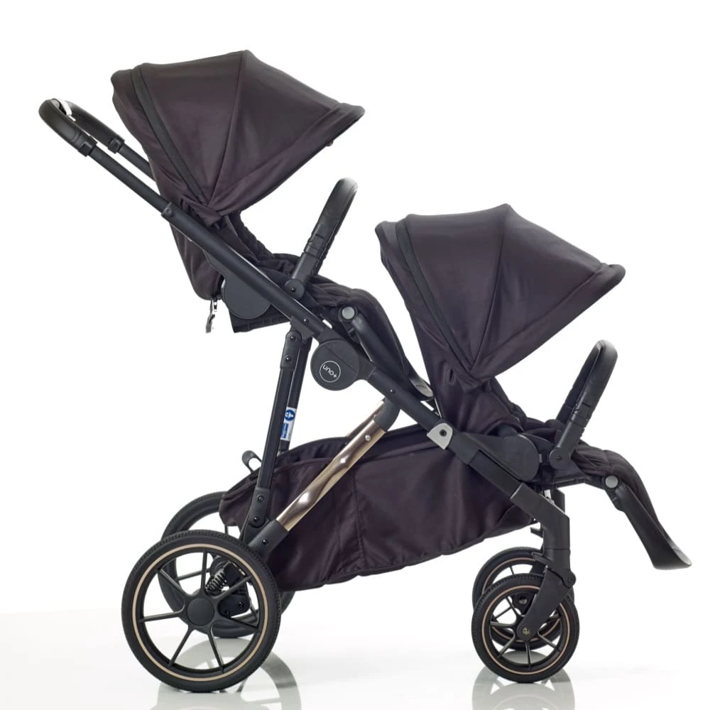 The Mee-Go UNO+ Twin Tandem Maxi-Cosi Travel System Bundle Black/Rose is the ultimate pushchair that will grow with your family. Whether you are looking for one child, siblings, or even twins, the Mee-go UNO+ is the answer. This system offers ultimate comfort for your baby while being a practical and stylish option for parents.