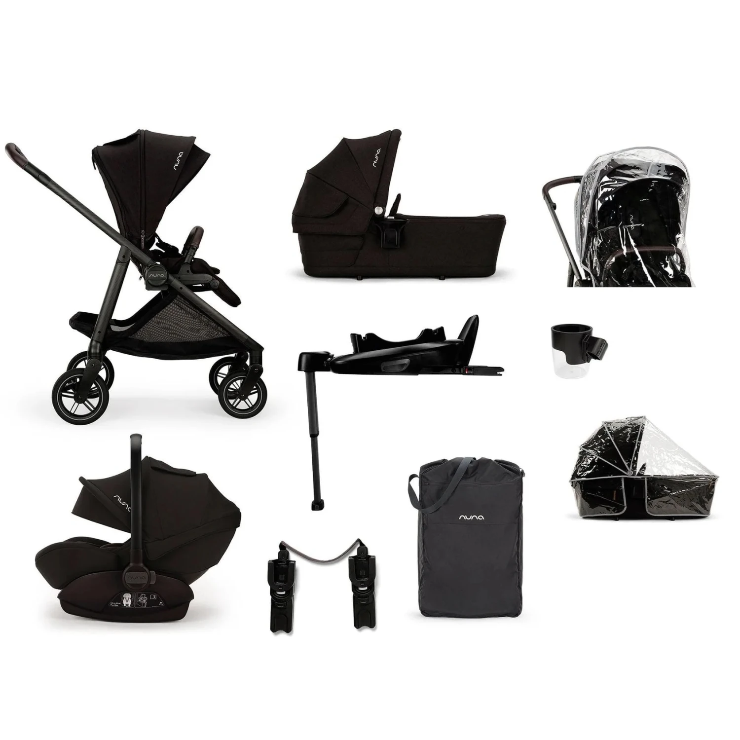 The Nuna Swiv Stroller, carrycot, Nuna Arra Next Car Seat, Nuna Next Base, Car seat adapters, Travel Bag, cupholder & raincovers for both the stroller and carrycot