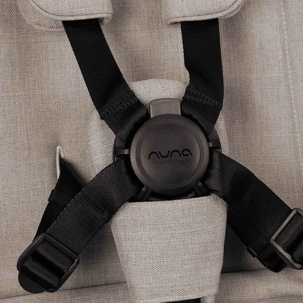 The harness has a Nuna patented MagneTech Secure Snap, which is a self-guiding magnetic buckle automatically locks into place, no more struggling with a complicated buckle.