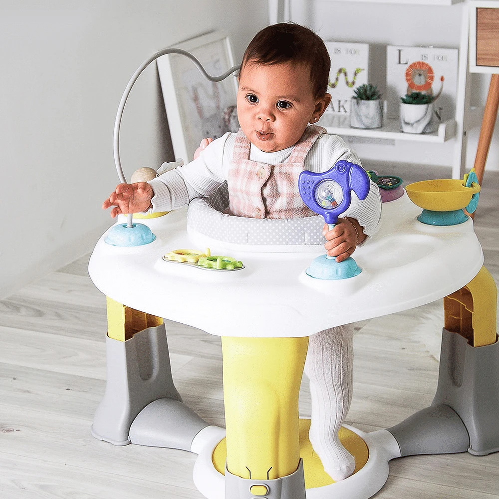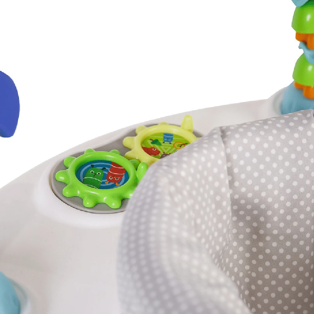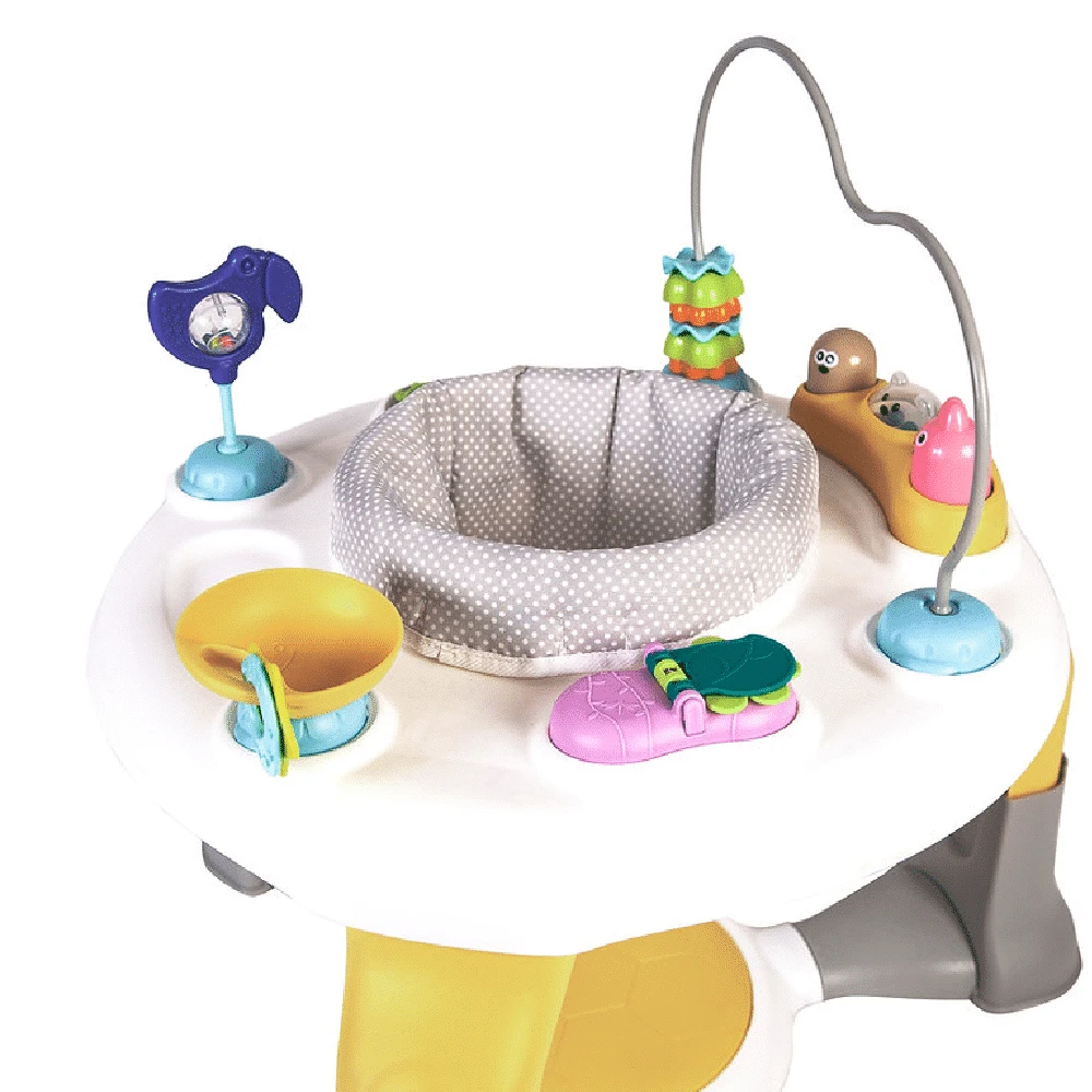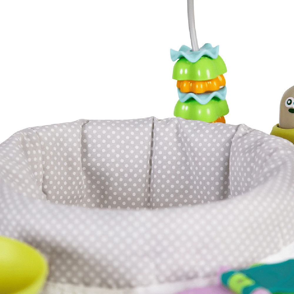 - Unique spring jumping base allows baby to bounce away!