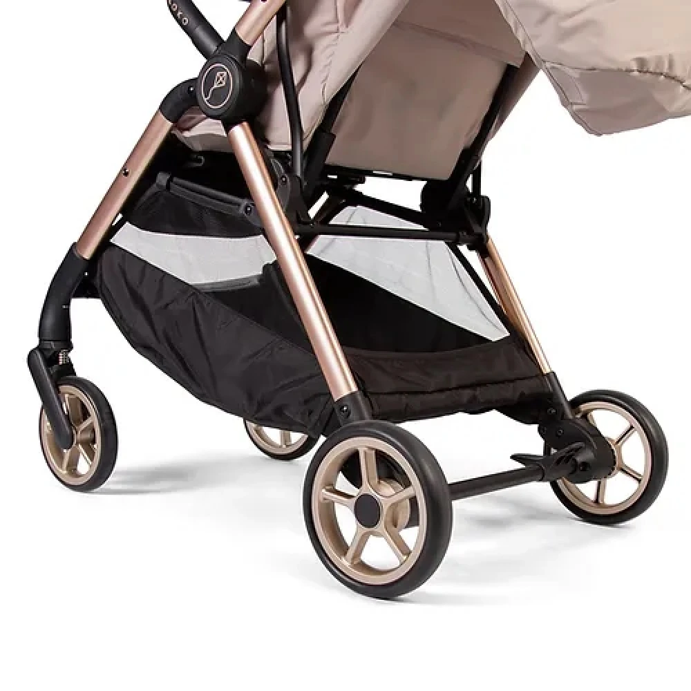 Red Kite Push Me Koko Compact Stroller – Latte featuring recycled plastic fabrics to support eco values and innovation. Featured on a champagne lightweight anodised chassis that sets this model into a class of its own and is supporting the environment at the same time.