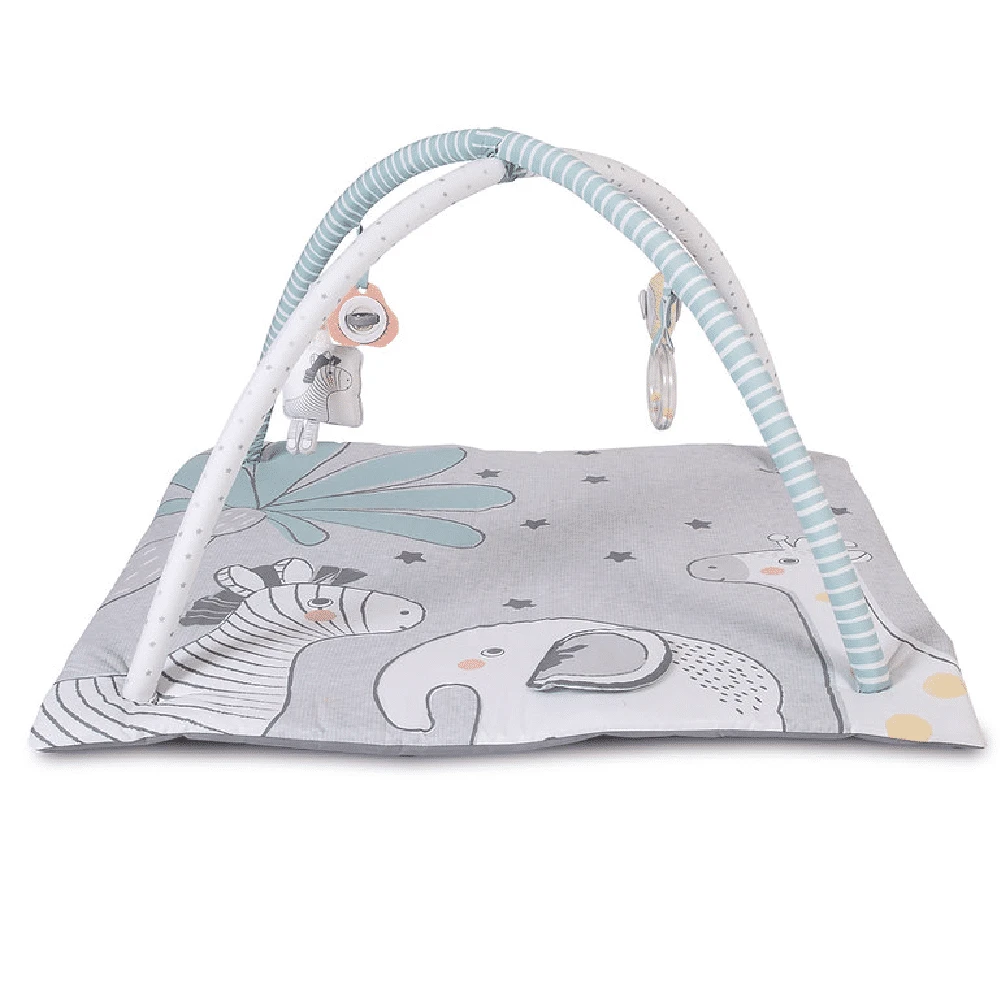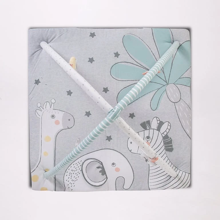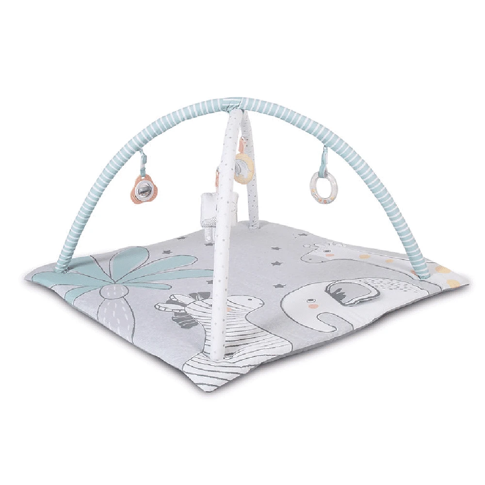 Crinkle fabric hidden activities in the mat coupled with detachable toys on the overhead play arches.