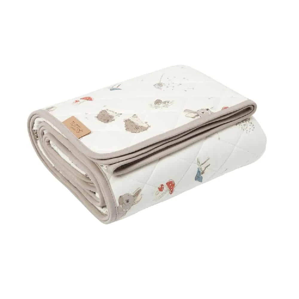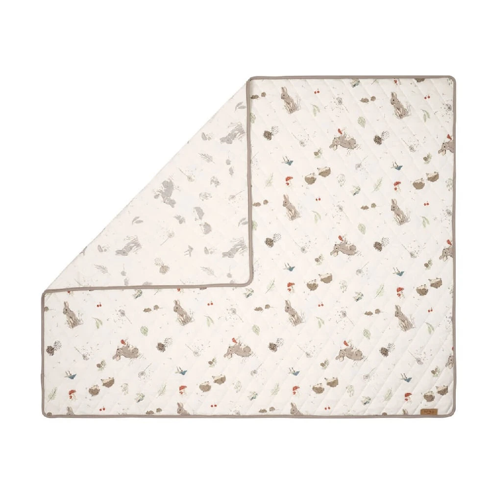 - The coverlet features woodland motifs like rabbits, hedgehogs, frogs, wild mushroom and leaves on a cream colour base.