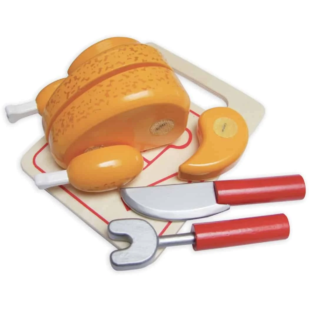 - The Roast Chicken to Cut from Vilac is a wooden chicken with wooden tools to carve it up for dinner.